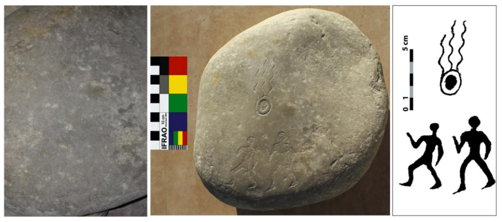 Campione Ida 1 (Ida Ou Kazou, provincia di Essaouira, Marocco): classificato come Petroglifo, in Arenaria (20 x 17 x 5 cm, circa), avente profondi solchi incisi raffiguranti due esseri umani (una donna ed un uomo) e forse un meteorite! (Credits: Archaeoastronomy and Ancient Technologies, 2018).